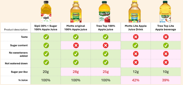 ✅ Sipli: 30-80% less natural sugar than traditional juices — without sacrificing taste.